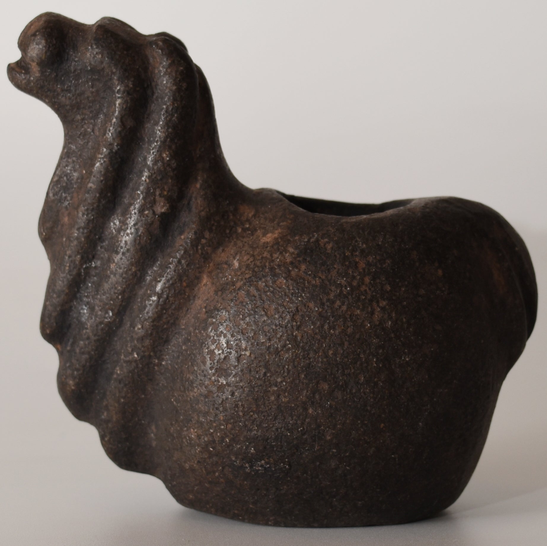 Vintage Andean alpaca conopa made of hand carved stone, purchased in Pisac Peru. Conopas are typically carved from a fine dark brown grained stone, then polished with sand and water. They have a hole in the back called a qocha (lagoon) and are used for offerings during a haywarisqa ceremony. The qocha is typically filled with llama fat mixed with coca leaves. Some Andean people use the them as a kind of amulet; they place them in a dedicated space in their homes. Approx. 4" long, 3 1/4" tall, and 2" wide S52504